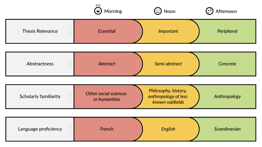 On a typical day, the energy level is highest in the morning and then decreases steadily over the course of the day – at least for me. Therefore, I try to economise on my best hours by allocating the bright morning hours to the most demanding texts, spending noon with the moderately difficult ones, and restricting myself to solely simple reading later in the afternoon. What is important here is to realise that a text can be demanding in several ways. Out of these I find the following four ways the most pertinent for my reading strategy: 1) how relevant it is for my PhD thesis, 2) how abstract it is, 3) how familiar I am with the scholarly tradition it’s part of, and 4) how good I am at the language it’s written in.